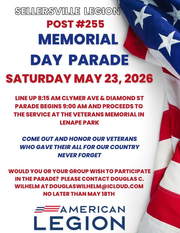 The 2026 Sell-Perk Memorial Day parade will be held in Sellersville on May 23rd. The parade will start lining up at 0815 and will kick off at 0900.